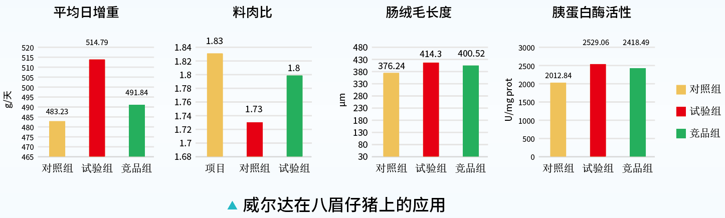 結(jié)論:日糧添加0.05%威爾達(dá)產(chǎn)品后,相較于對(duì)照組,仔豬平均日增重提高了6.53%,料肉比降低5.46%,絨毛長度提高10.12%,腸道胰蛋白酶活性提高25.65%。顯著提高了生長性能,節(jié)約飼料成本,提高效益。